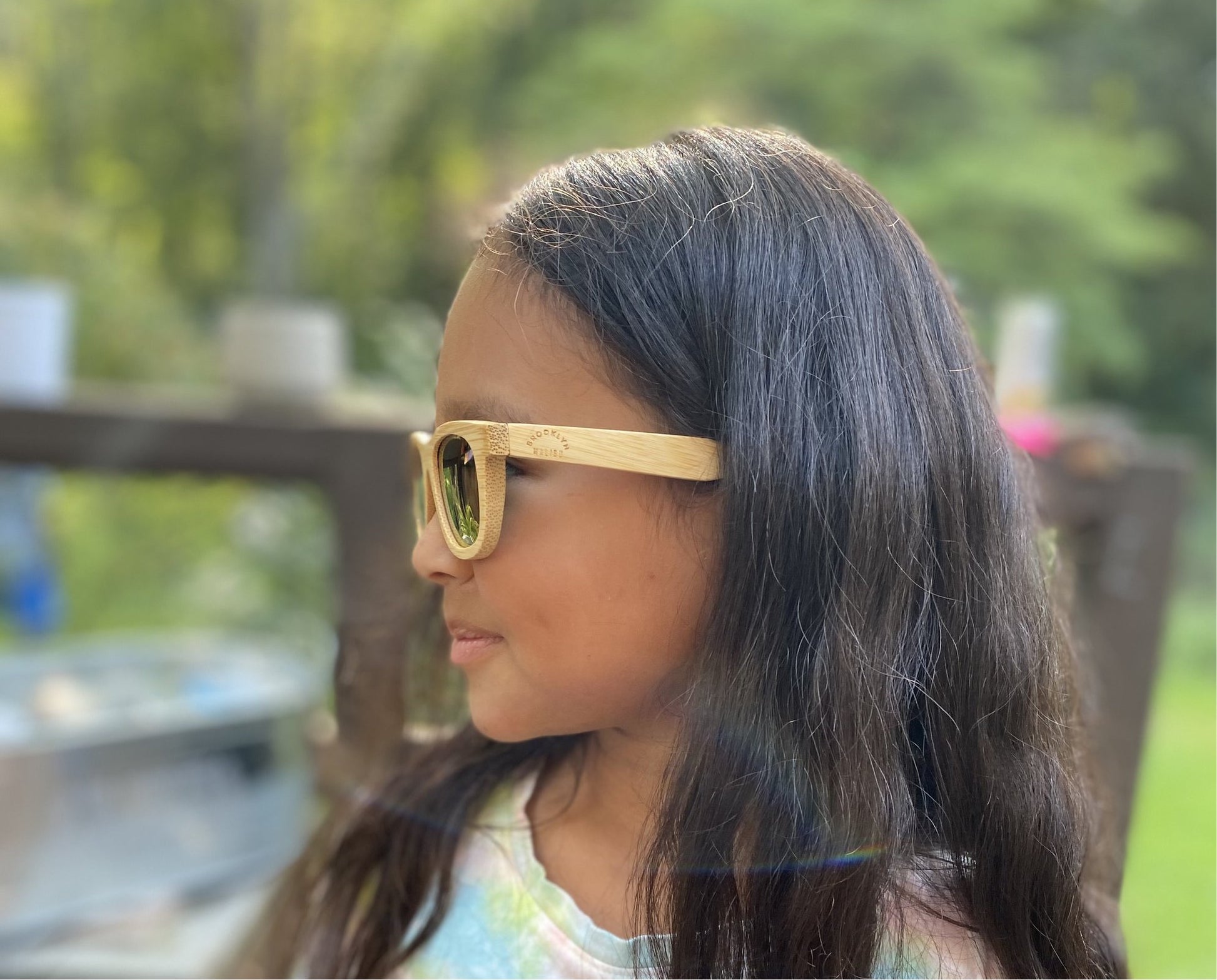 Our signature Jaxon bamboo sunglasses are sleek and eco-friendly, keeping your kids looking fresh while supporting better sustainable choices in their style. The Brooklyn Malibu logo is laser-engraved on one side of the sunglass arm (aka the sunglass temple).